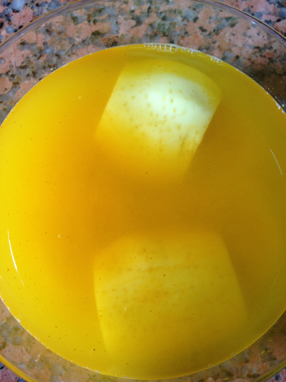 Now keep the caps n potatoes in water ( water, 1tsp salt & 1 tsp turmeric powder). Potatoes should be totally immersed in this haldi salt water. Keep it for 1 hr.